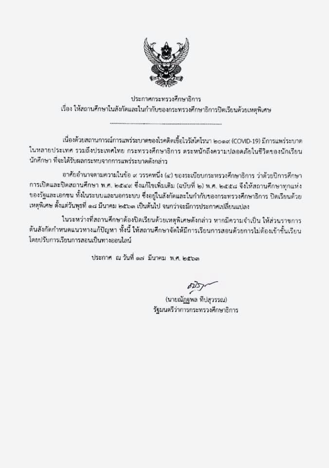 ศธ.สั่งสถานศึกษาทั่วประเทศ ทั้งรัฐและเอกชน ปิดเรียนด้วยเหตุพิเศษ ป้องกันการแพร่ระบาดโควิด-19