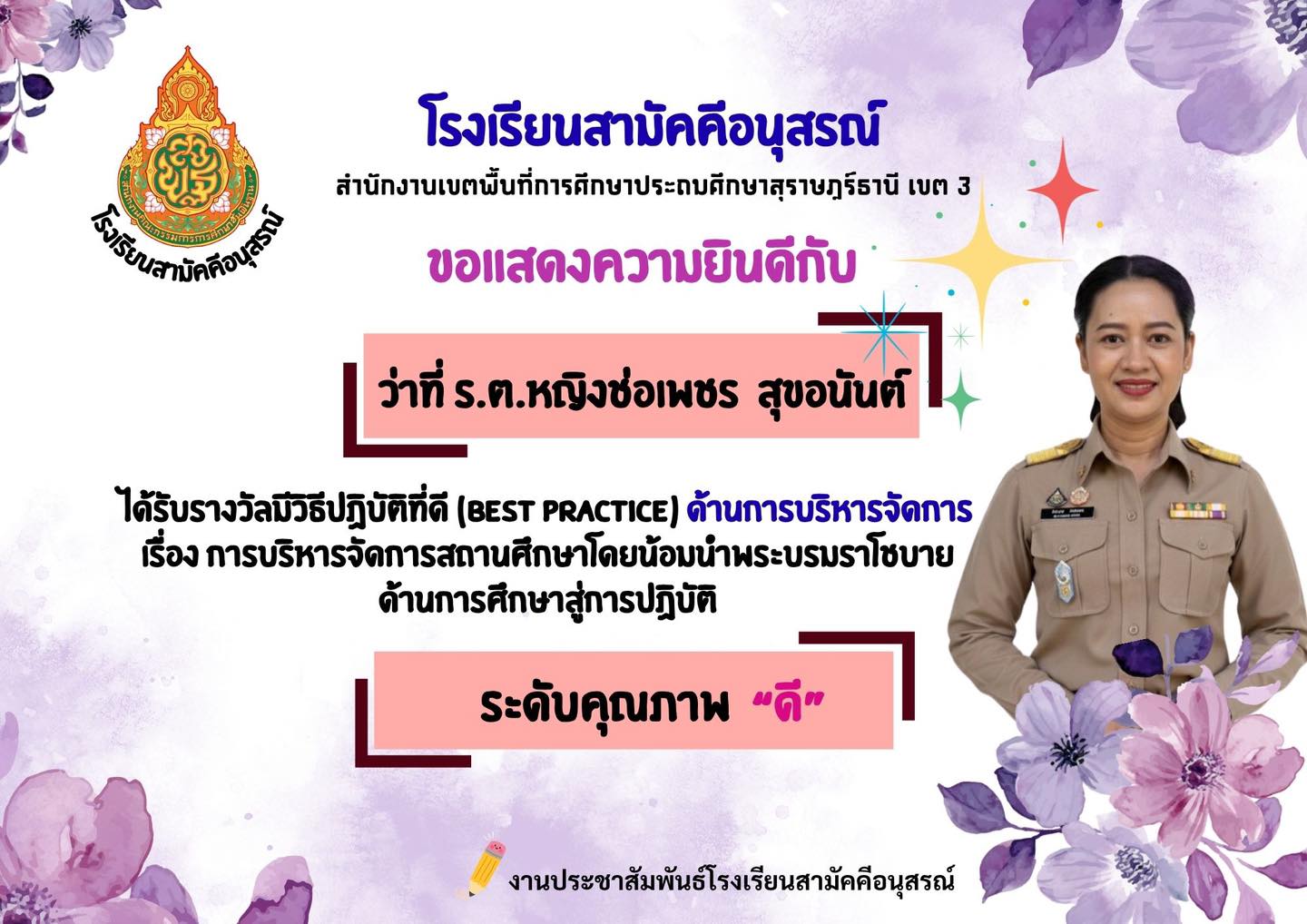ชื่อผลงาน : วิธีปฏิบัติที่ดี (Best Practice) ด้านการบริหารจัดการ เรื่อง การบริหารจัดการสถานศึกษาโดยน้อมนำพระบรมราโชบายด้านการศึกษาสู่การปฏิบัติ ระดับคุณภาพดี