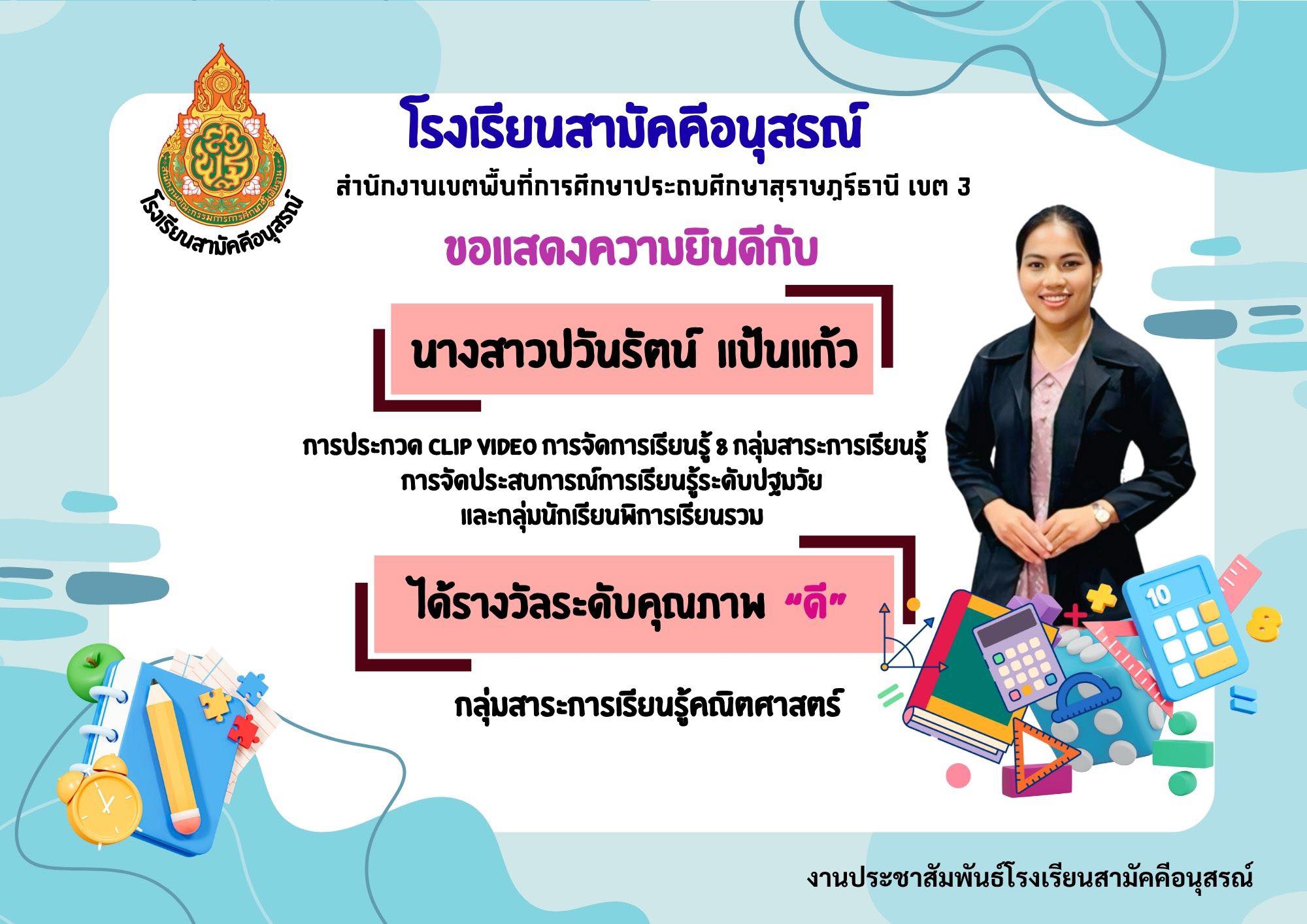 ชื่อผลงาน : การประกวดสื่อ Clip video การจัดการเรียนรู้ 8 กลุ่มสาระการเรียนรู้ การจัดประสบการณ์การเรียนรู้ระดับปฐมวัย และกลุ่มนักเรียนพิการเรียนรวม ประจำปีงบประมาณ พ.ศ. 2568
